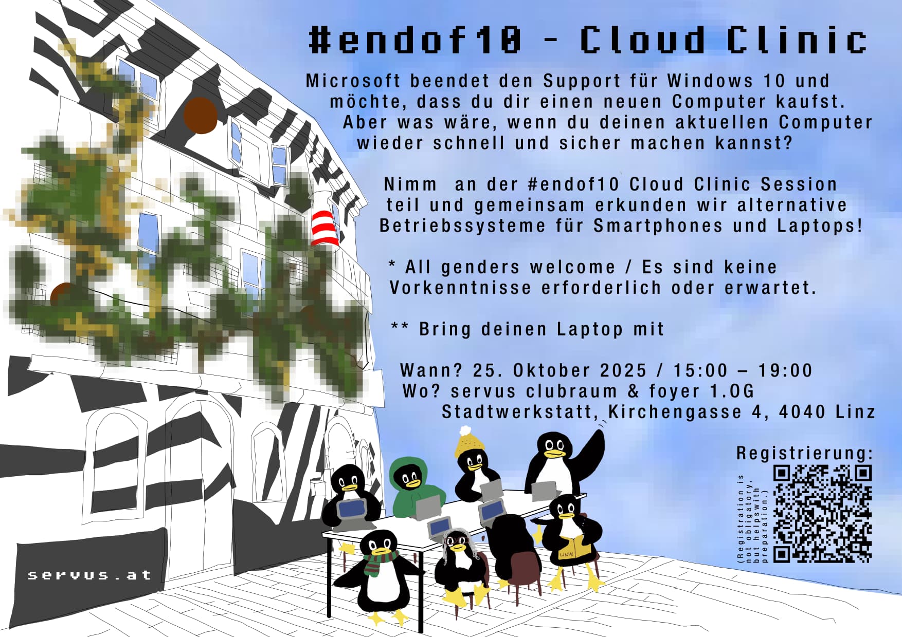 Als Reaktion auf das Ende des Supports für Windows 10 am 25. Oktober wird die Community rund um die österreichische Medienkunstinitiative servus.at – Kunst und Kultur im Netz gemeinsam alternative Betriebssysteme für Smartphones und Laptops sowie befreiende Arbeitsabläufe erkunden, die uns von Design- und Kommunikationswerkzeugen großer Unternehmen unabhängig machen.